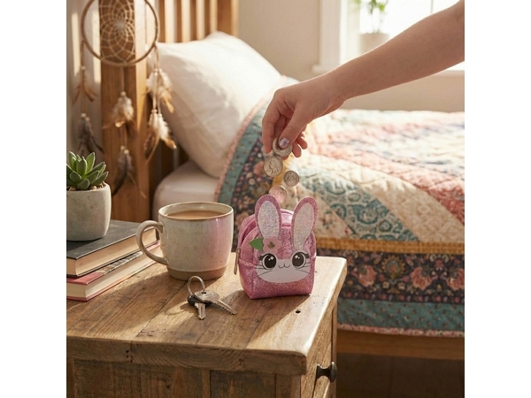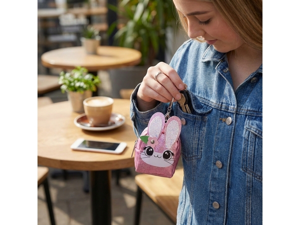 Sprinkle a dash of fun and sparkle to your little ones day with this adorable bunny-themed coin purse, featuring a zippered padded compartment and keychain. The shimmering pink sequins and whimsical details are perfect for school or playtime adventures, to carry notes, lip gloss, pocket mirror and other small items