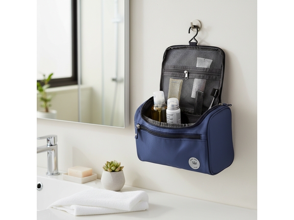 Includes main zip compartment with inner small hanger, fully lined inner for easy cleaning and 1 mesh zip compartment for additional storage. With additional zip compartment on front of toiletry bag and nylon handle on the side for easy carrying