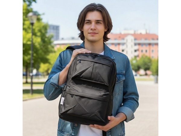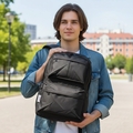 A sturdy Laptop Backpack with a USB charging port, divided sections with a shock-absorbing pad, and a Velcro closure for your laptop. It features a spacious main compartment for documents and accessories, two front pockets, adjustable side clasps, an aluminum-handled grip, and padded straps.